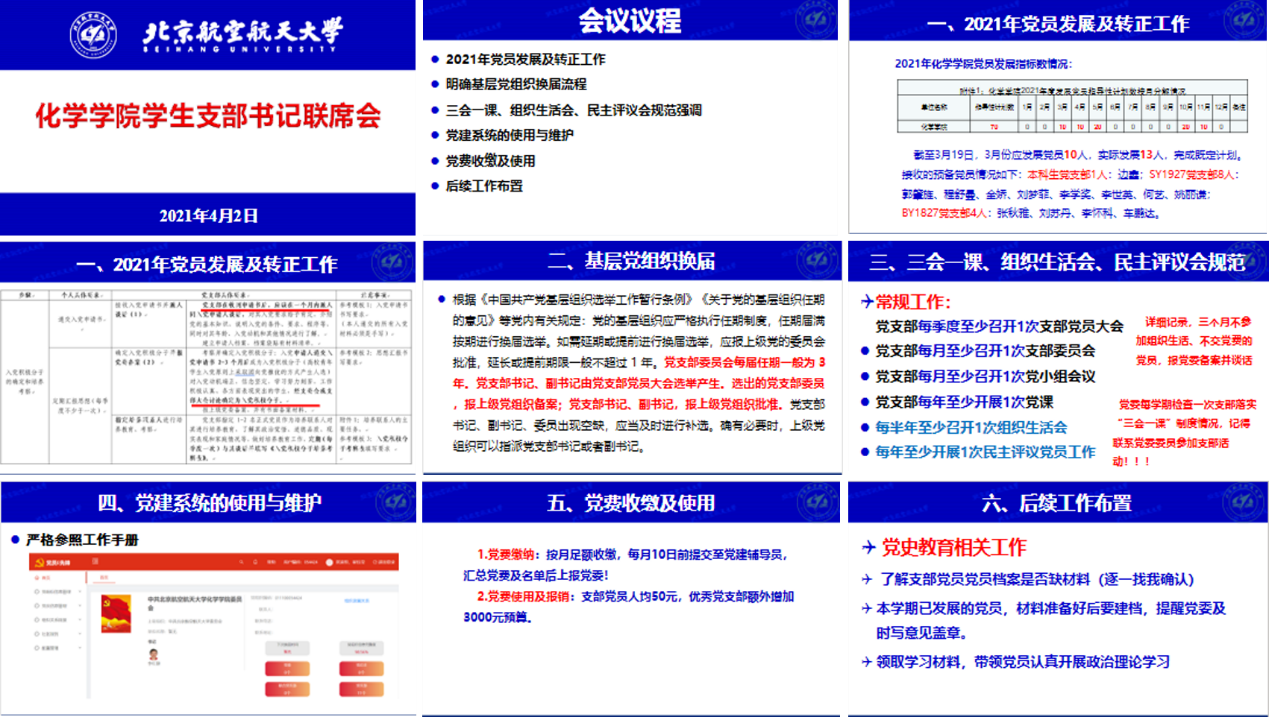 2021年4月2日,化学学院学生党支部书记联席会暨党务工作交流会在沙河实验4-206会议室顺利召开。本次会议由专职组织员崔钰莹老师主持,化学学院分团委副书记魏茜、各学生党支部书记参加本次会议。