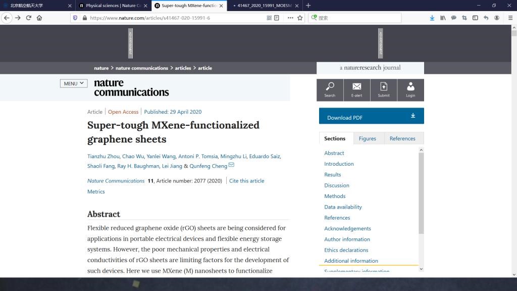 2020年4月29日,Nature Communications杂志以在线全文Article的形式发表了我院程群峰教授课题组在超韧材料的最新研究成果“Super-tough MXene-functionalized graphene sheets”。周天柱博士、吴超教授、王艳磊副研究员为第一作者,程群峰教授为通讯作者,北京欧美大片ppt免费大全化学学院为第一完成单位。